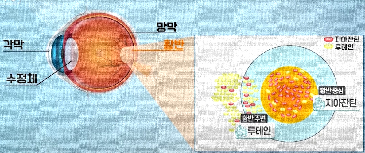 바로 지아잔틴이라는 성분입니다. 이 두 가지 영양소 섭취는 황반을 지켜 눈 건강에 도움이 됩니다.