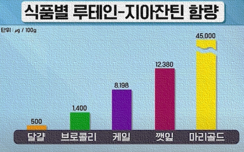 메리골드(마리골드) 속에는 황반 건강에 도움되는 루테인과 지아잔틴이 매우 풍부하게 들어 있다. 메리골드(마리골드) 100g 당 45,000㎍ (달걀의 90배, 브로콜리의 32배, 시금치의 4배, 깻잎의 4배)