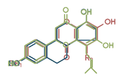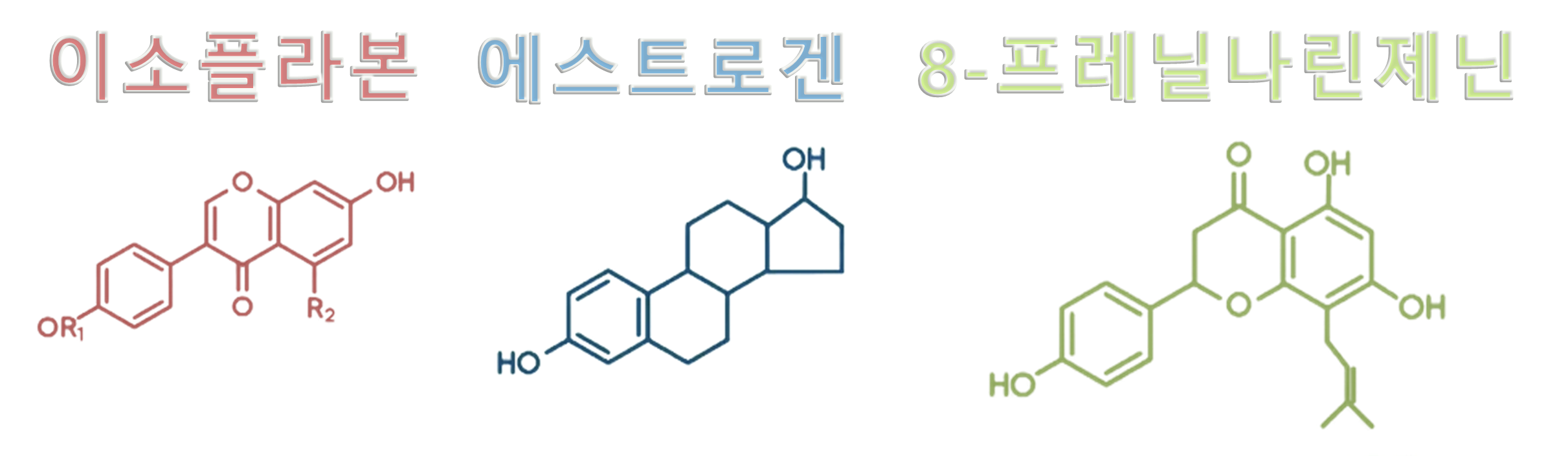 그림에서 보는 것과 같이 이소플라본과 8-프레닐나린제닌은 여성호르몬인 에스트로겐의 분자구조와 비슷한 것을 알 수가 있습니다.