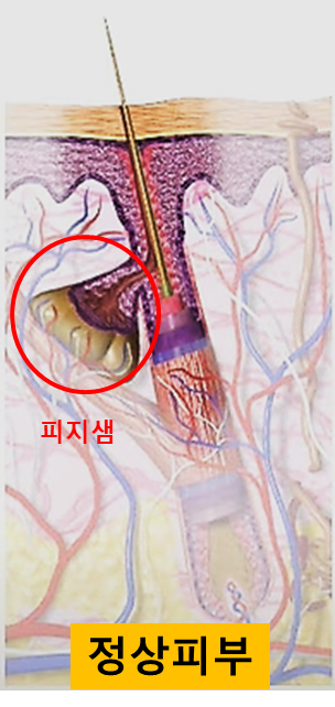 모공 속을 들여다보면 털이 있는 중간에 피지를 분비하는 피지샘이 있습니다. 바로 이곳이 문제의 근원지입니다.