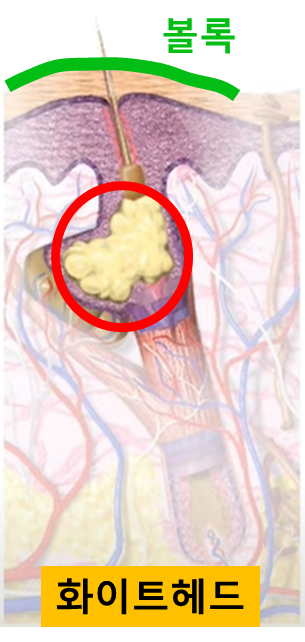 화이트헤드는 피지샘에서 분비되는 피지가 모공이 막혀 외부에 노출되지 않은 상태로 볼록 튀어나와 하얗게 보이기 때문에 화이트헤드라고 합니다.