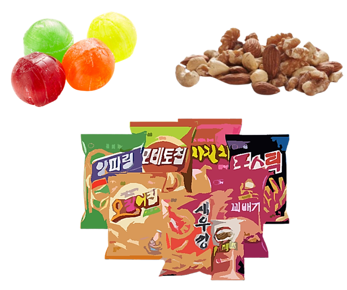 사탕, 견과류, 과자는 점막에 상처를 많이 줍니다.