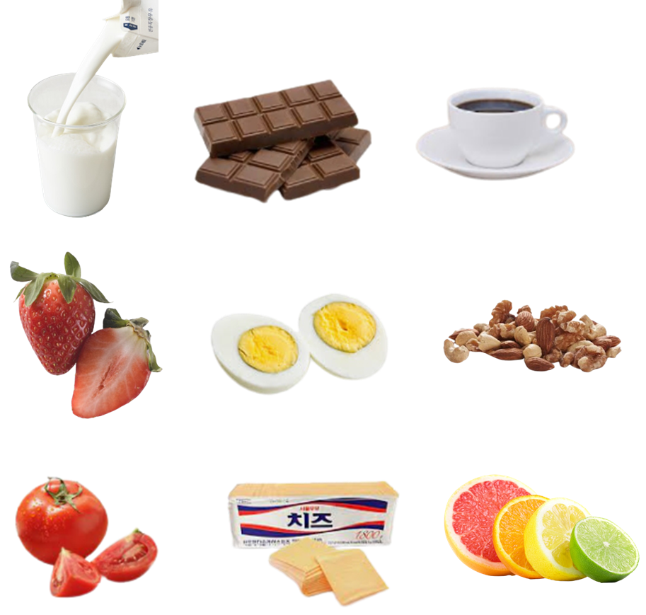 ☞ 구내염을 잘 일으키는 음식에는 우유, 초콜릿, 커피, 딸기, 계란, 견과류, 토마토, 치즈, 감귤류 등이 있습니다.