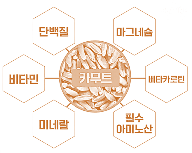 2. 카무트에는 단백질, 마그네슘, 비타민, 베타카로틴, 미네랄, 필수 아미노산 등 18종의 다양한 영양소가 고루 함유되어 있다.