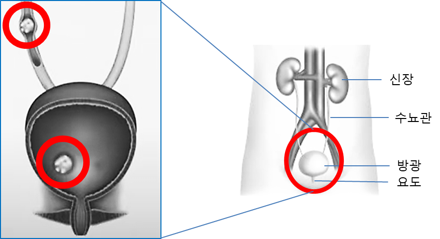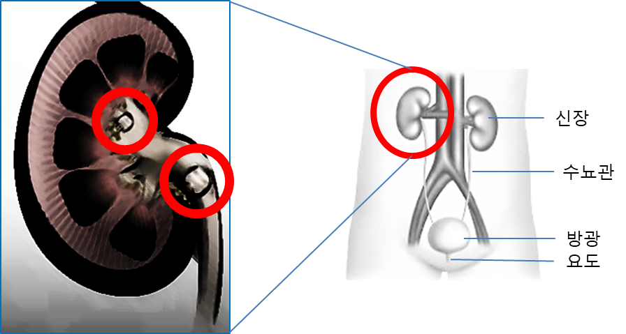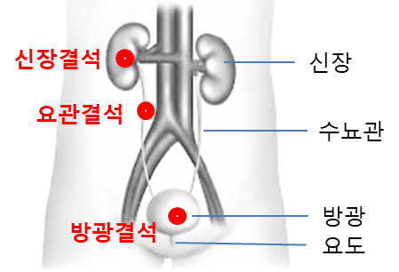 요로결석이 생기는 곳은 소변이 지나는 전체의 길에 해당된다.