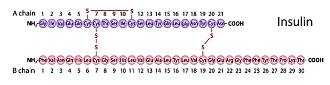 그림에서 보듯이 결합에 이황화물이 관여하고 있다. 즉, 황이 부족하면 인슐린이 잘 만들어지지 않는다.