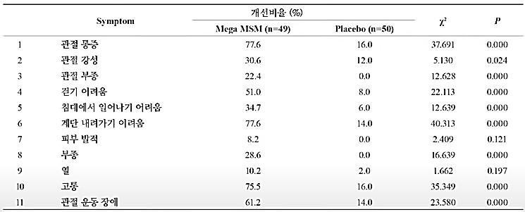 MSM은 염증반응에 관여하는 NF-KB와 염증성 사이토카인(IL-6나 TNF-α)을 억제시킨다.