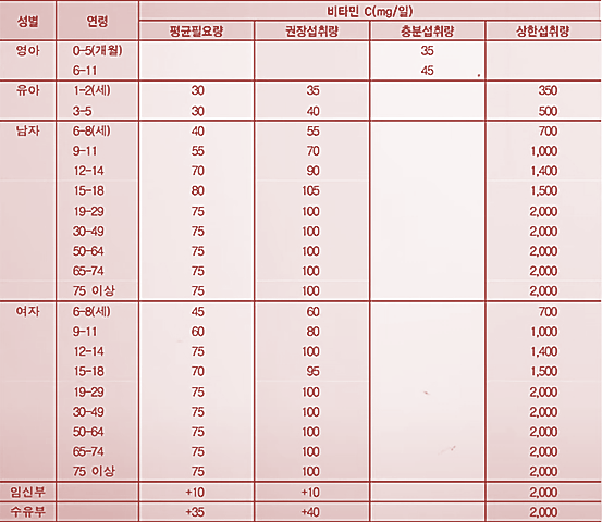 비타민C의 성인 1일 섭취 권장량은 한국영양학회 기준으로 75~100mg 정도이고 상한섭취용량이 2000mg 정도이다.