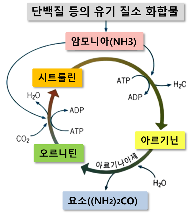 '오르니틴회로'는 단백질을 분해한 후 생긴 암모니아나 질소를 상대적으로 독성이 약한 요소로 전환시키는 회로도이다. 여기에서 핵심 물질인 오르니틴과 아르기닌이 충분히 생성되어 있으면 질소 해독에 많은 도움이 된다.