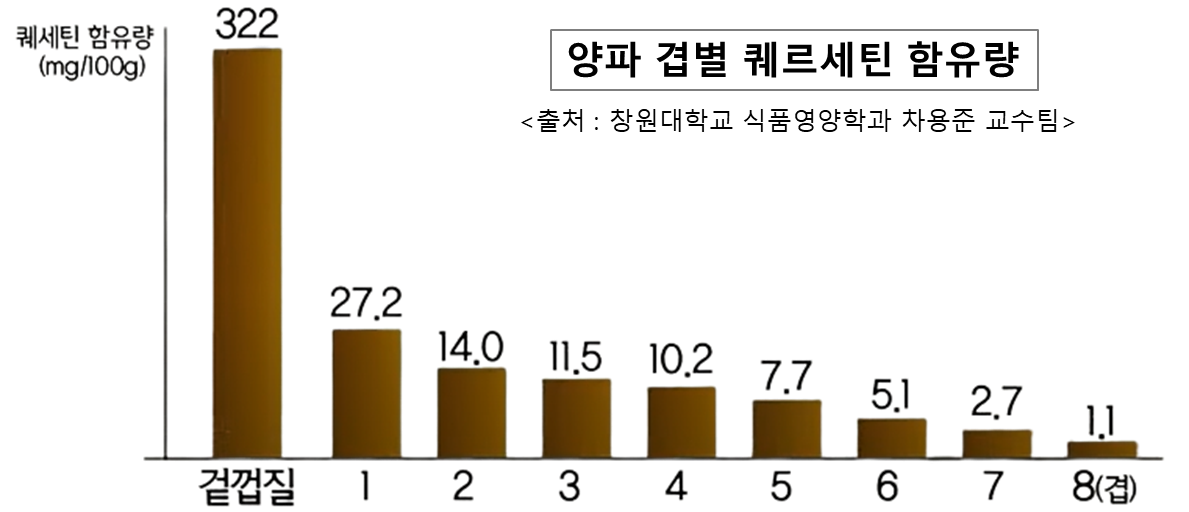 양파 100g당 퀘르세틴 32mg 함유되어 있는데 양파껍질에는 322mg 함유되어 있다.