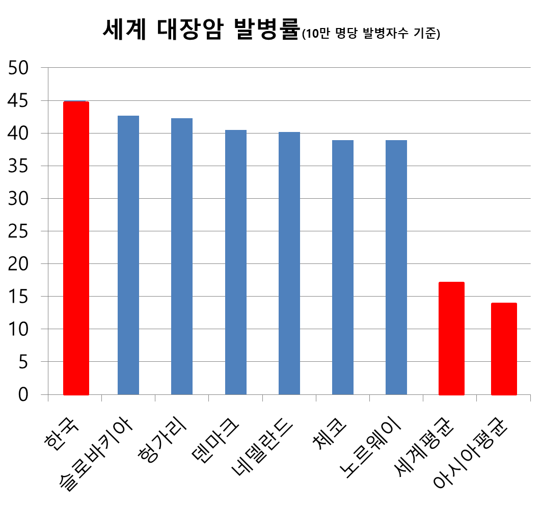 우리나라의 대장암 발병률은 세계 평균의 두 배정도다.