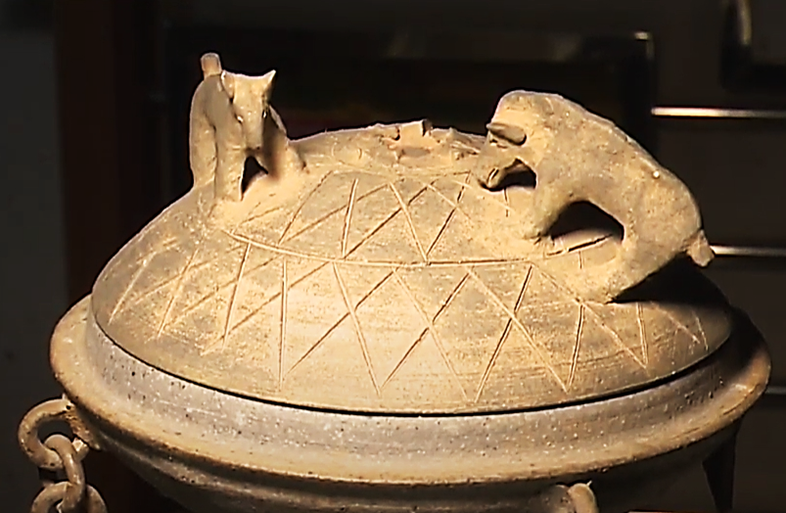 출토된 토기 뚜껑에는 맷돼지와 대치중인 동경이를 볼 수 있다. 아마 동경이는 사냥개로 활용된 것으로 보인다.