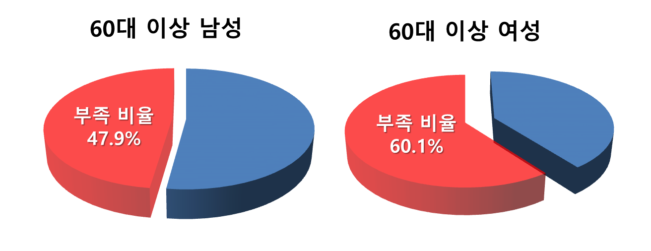 60대 이상 성인의 단백질 섭취량을 분석해서 단백질 부족을 겪는 성인의 비율을 조사해 보았더니 남성은 47.9%, 여성은 60.1%로 나타났다.