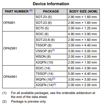 The OPAx991 family of op amps is available in microsize packages (such as X2QFN, WSON, and SOT-553), as well as standard packages (such as SOT-23, SOIC, and TSSOP), and is specified from – 40°C to 125°C.
