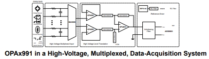 Unique features such as differential and commonmode input-voltage range to the supply rail, high output current (±75 mA), high slew rate (21 V/µs), high capacitive load drive (1 nF) and shutdown functionality make the OPAx991 a robust, highperformance operational amplifier for high-voltage industrial applications.