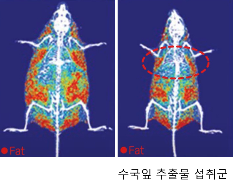 고지방식이를 유도한 쥐에게 수국잎 추출물 300mg을 5주간 섭취하게 한 결과 대조군보다 지방세포가 감소한 결과를 확인했다.