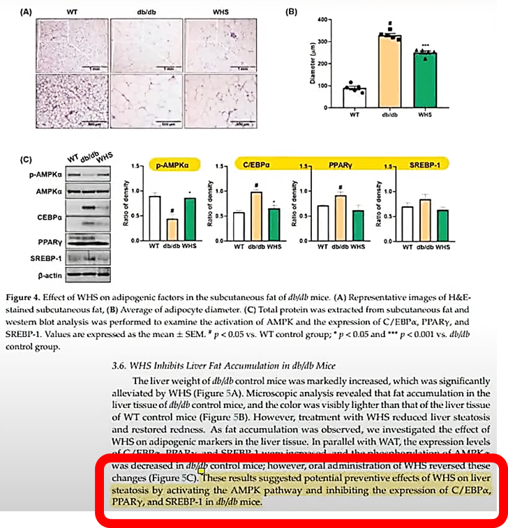 AMPK는 주로 간, 근육, 지방, 췌장에서 작동하는 효소로 AMPK가 활성화되면 가만히 있어도 약 30분간 러닝머신을 뛰는 것과 비슷한 효과와 같다. 즉, 신진대사와 기초대사량을 증가시켜 콜레스테롤 축적을 방지하여 체지방을 감소시켜준다.