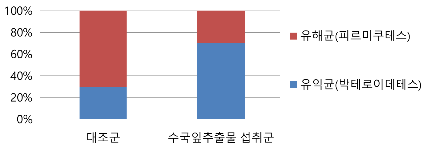 수국잎 추출물을 꾸준히 섭취할 경우 비만 세균으로 알려진 유해균인 피르미쿠테스를 감소시키고 유익균인 박테로이데테스를 증가시켜 장 내 환경을 개선되었음을 확인했다.