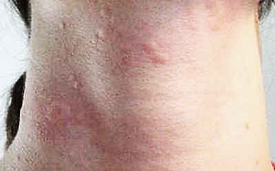 1~2mm 정도의 작은 팽진이 나타나는 것은 땀띠와 비슷한데 주로 체간에 발생한다.