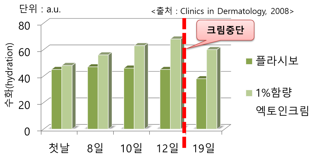 엑토인 크림을 바르고 중단한지 7일이 지났을 때 수분 보습력을 검사한 결과 대조군에 비해 200% 증가한 것을 확인했다.