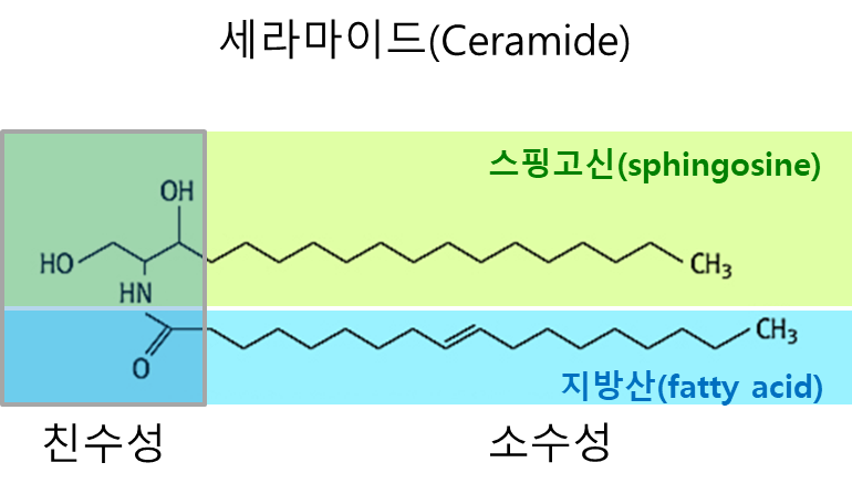 세라마이드는 스핑고신(sphingosine)과 지방산(fatty acid)이 결합하여 구성된 것이다.