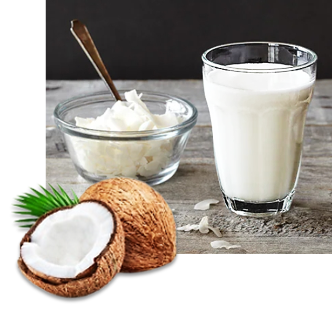 코코넛 밀크는 흰색 과육을 갈아 물을 섞어 만드는데 수분이 50%, 코코넛 지방 함유가 매우 높다.