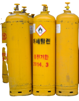 용해가스는 15℃에서의 압력이 0㎩을 초과하는 가스로, 아세틸렌(C2H2)을 예로 들 수 있으며, 매우 특별한 경우로서 압축하면 분해폭발하는 성질 때문에 단독으로 압축하지 못하고, 용기에 다공물질의 고체를 충전한 다음, 아세톤과 같은 용제를 주입하여 이것에 아세틸렌을 기체상태로 압축한 것을 말합니다.