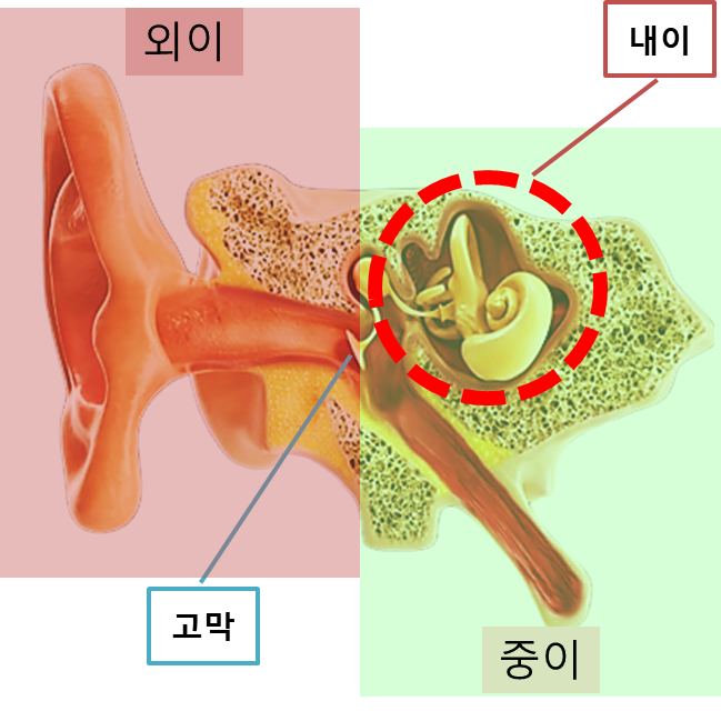고막을 중심으로 안쪽을 '중이', 바깥쪽을 '외이'라고 한다.