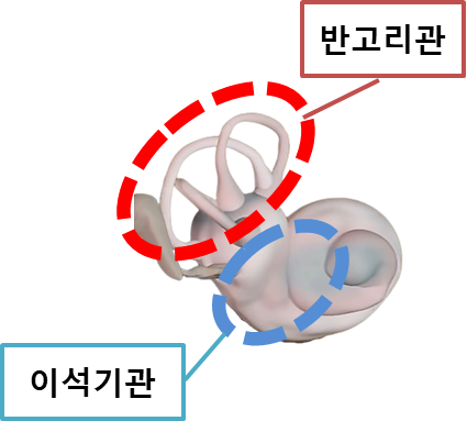 '전정기관'은 '반고리관'과 '이석 기관'으로 나뉜다.