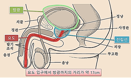 남성의 경우 요도 입구에서 방광까지의 거리가 약 17cm 정도 된다. 게다가 전립선이 방광 입구에 위치해 세균을 방어하는 역할도 해준다.