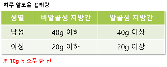 이러한 기준으로 그 이상 마시면 알콜성 지방간, 기준 이하로 마시면 비알콜성 지방간으로 나눌 수 있다.