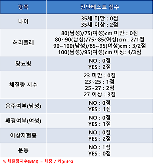위의 표를 보고 점수를 체크해서 8점 이상이면 지방간일 확률이 매우 높다.