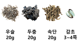 물 1.5~2리터, 우슬 20g, 두충 20g, 속단 20g, 감초 3~4쪽을 모두 넣고 30분간 팔팔 끓인 후 약불에 30~1시간 동안 우려낸다.