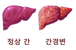 정상 간은 표면이 매끄럽고 선홍색을 띠는 반면에 간경변의 간은 표면이 거칠고 딱딱하다.