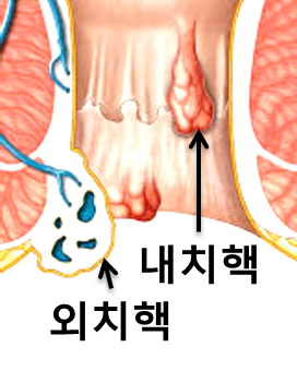 - 내치핵 : 속에서 늘어나 겉으로 튀어나온 것. 외치핵보다 통증이 더 심하다.