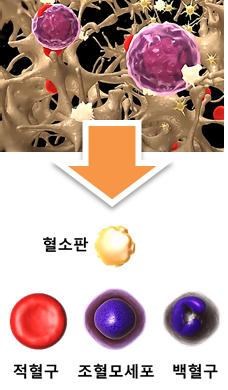 우리 몸의 뼈 안쪽에는 스펀지 같은 조직인 골수가 자리 잡고 있는데 골수 안에는 모든 혈액세포의 기원이 되는 조혈모세포가 있어서 적혈구, 백혈구, 혈소판을 만든다.