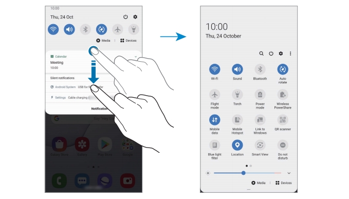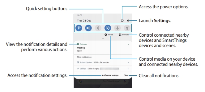 Tap quick setting buttons to activate certain features. Swipe downwards on the notification