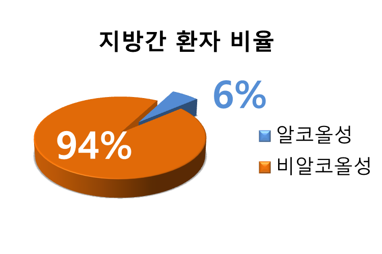 2023년 지방간 환자의 비율을 보면 알콜성 지방간은 6%, 비알콜성 지방간은 94%에 달한다. <출처 : 건강보험심사평가원>