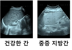 초음파 검사에서 지방간이 심하면 간이 하얗게 보인다. 너무 심하면 보여야 할 혈관이 하나도 보이지 않는다.