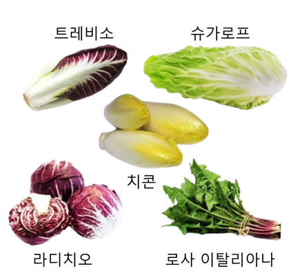 쌉싸래한 맛이 나는 채소로 우리가 아는 치커리 외에도 실은 종류가 많다.