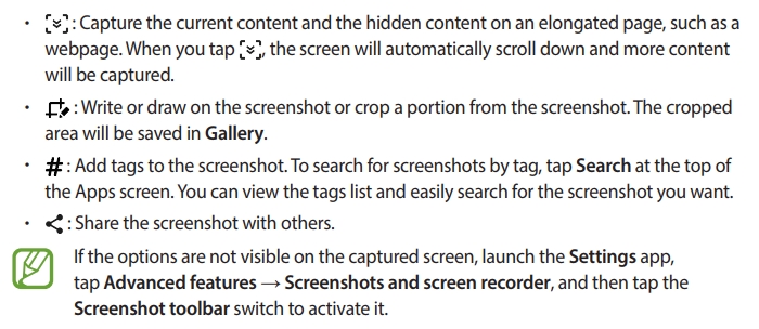 After capturing a screenshot, use the following options on the toolbar at the bottom of the