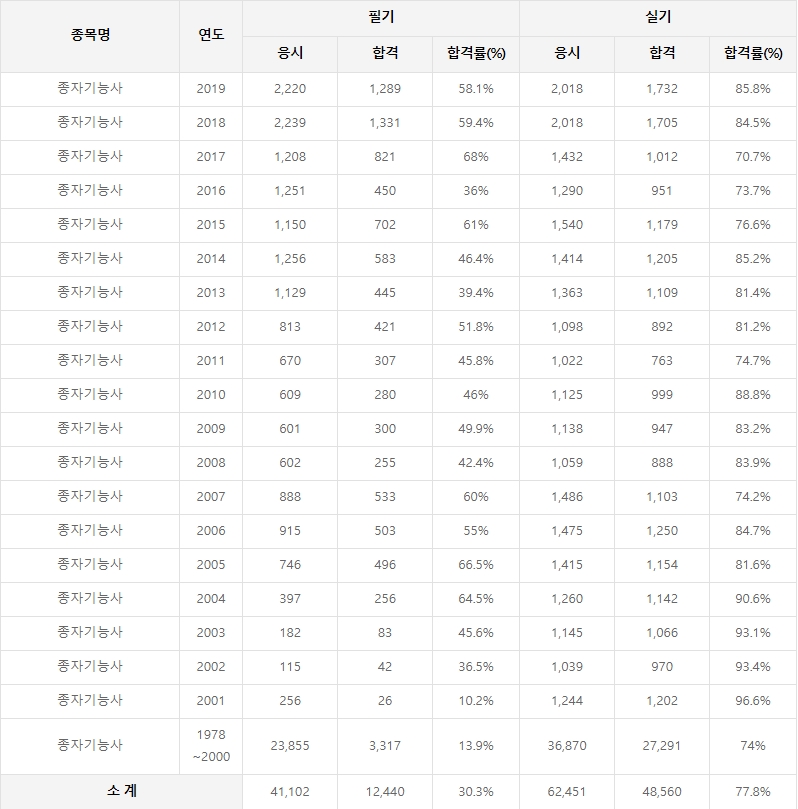 종자기능사 검정 현황 및 합격률